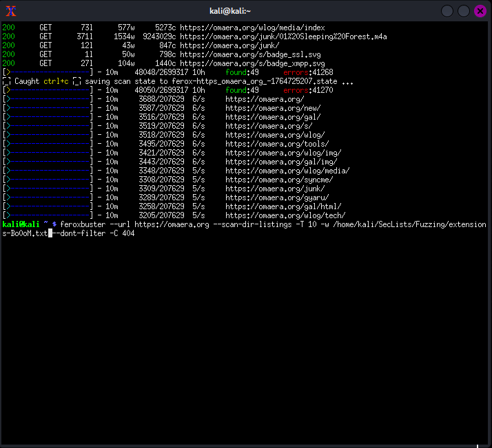 feroxbuster --url https://omaera.org --scan-dir-listings -T 10 -w /home/kali/SecLists/Fuzzing/fuzz-Bo0oM.txt --dont-filter -C 404